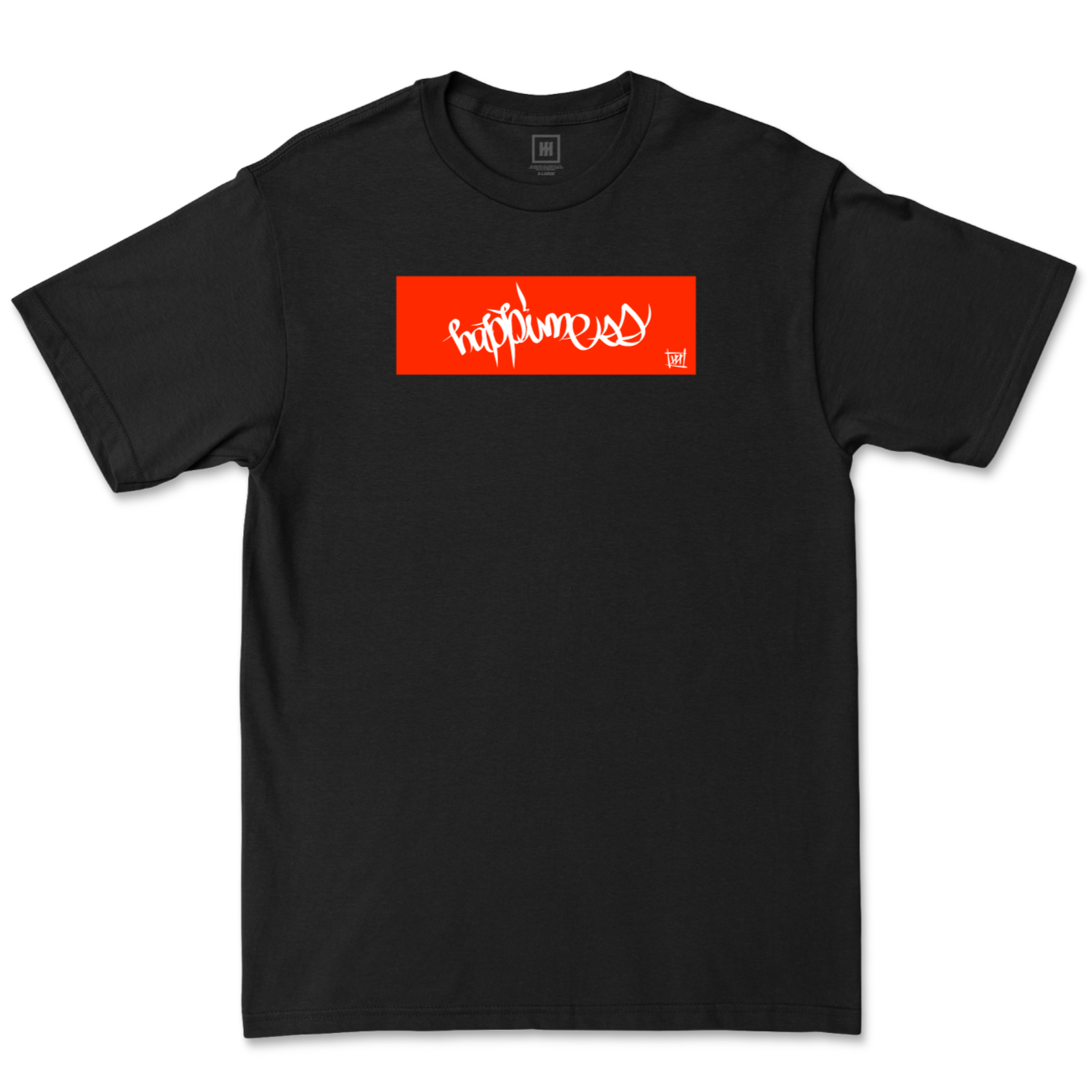 A simple clean hand-style cursive Happimess in White over a vibrant fire red rectangle, with our box logo signature.