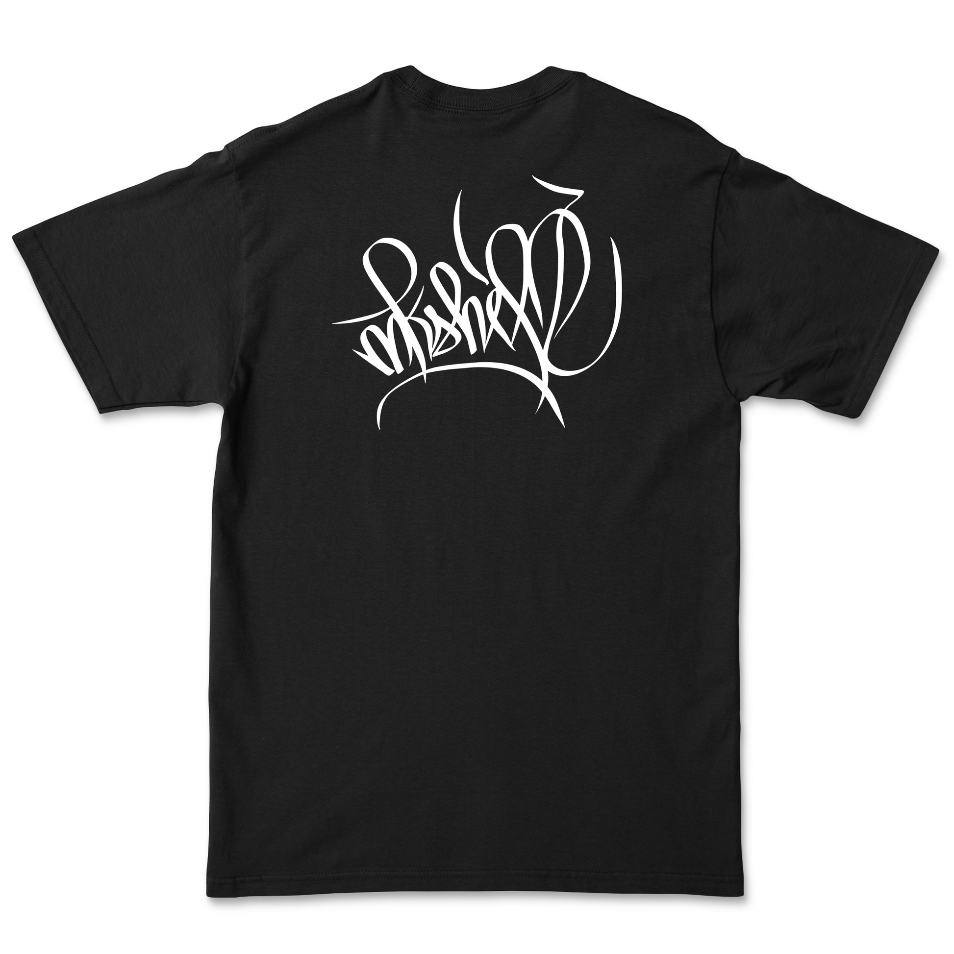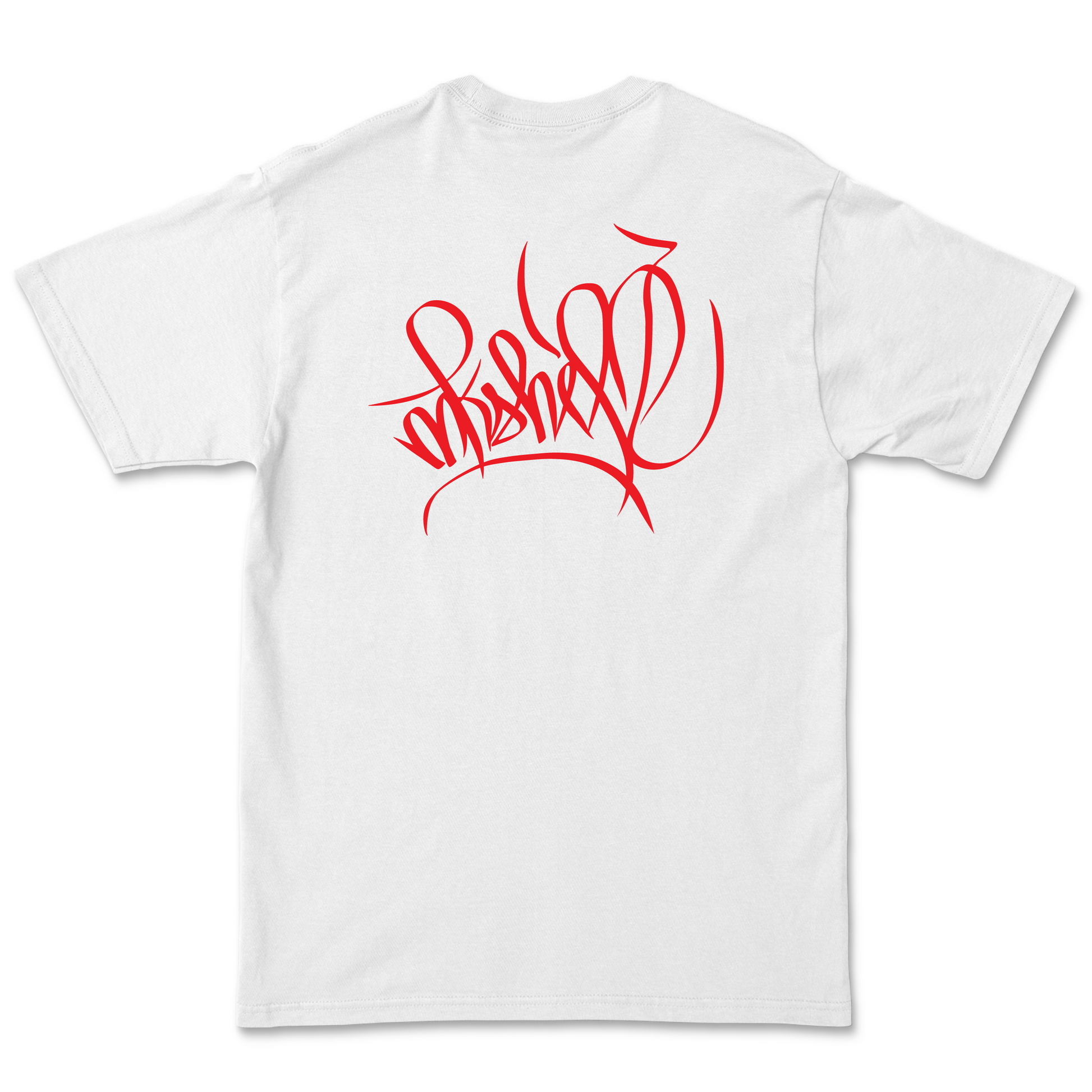 Our Box Logo pocket design, with a script hand style 'mkshift' on the rear. Available in White designs on Black Tees, or Fire Red designs over a White Tee!
